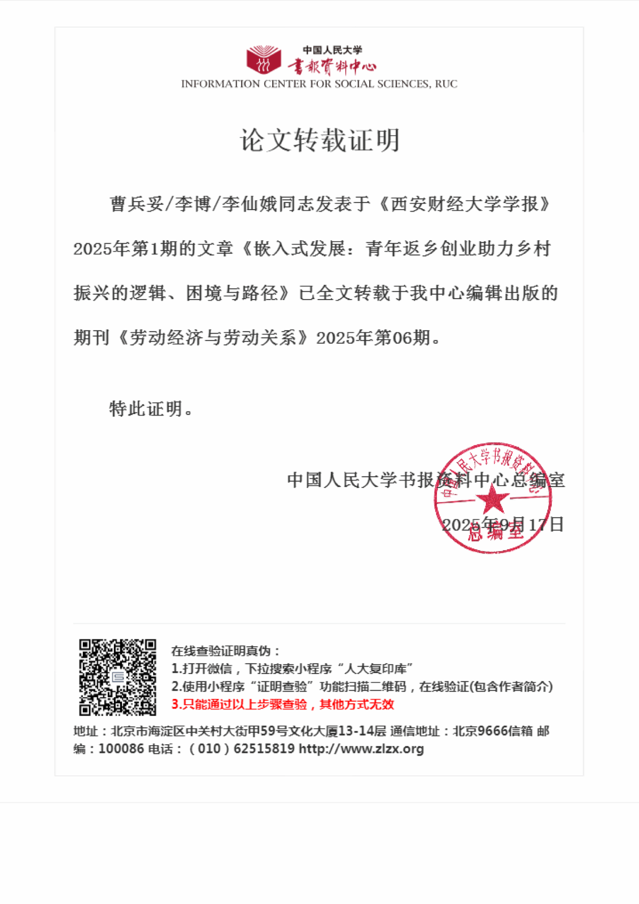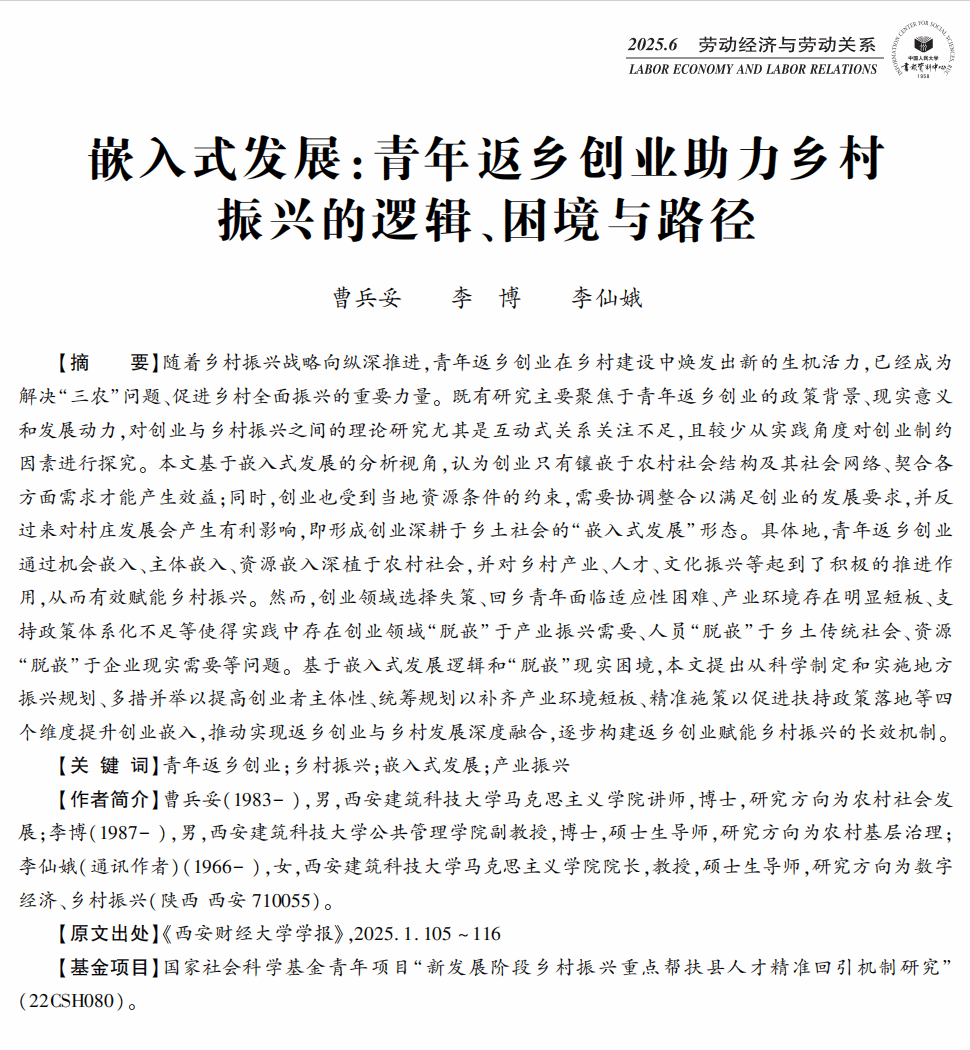 我院教师曹兵妥、李仙娥合作发表论文《嵌入式发展:青年返乡创业助力乡村振兴的逻辑、困境与路径》被中国人民大学报刊复印资料《《劳动经济与劳动关系》》2025年第06期全文转载,原文发表在《西安财经大学学报》(2025年第1期)。