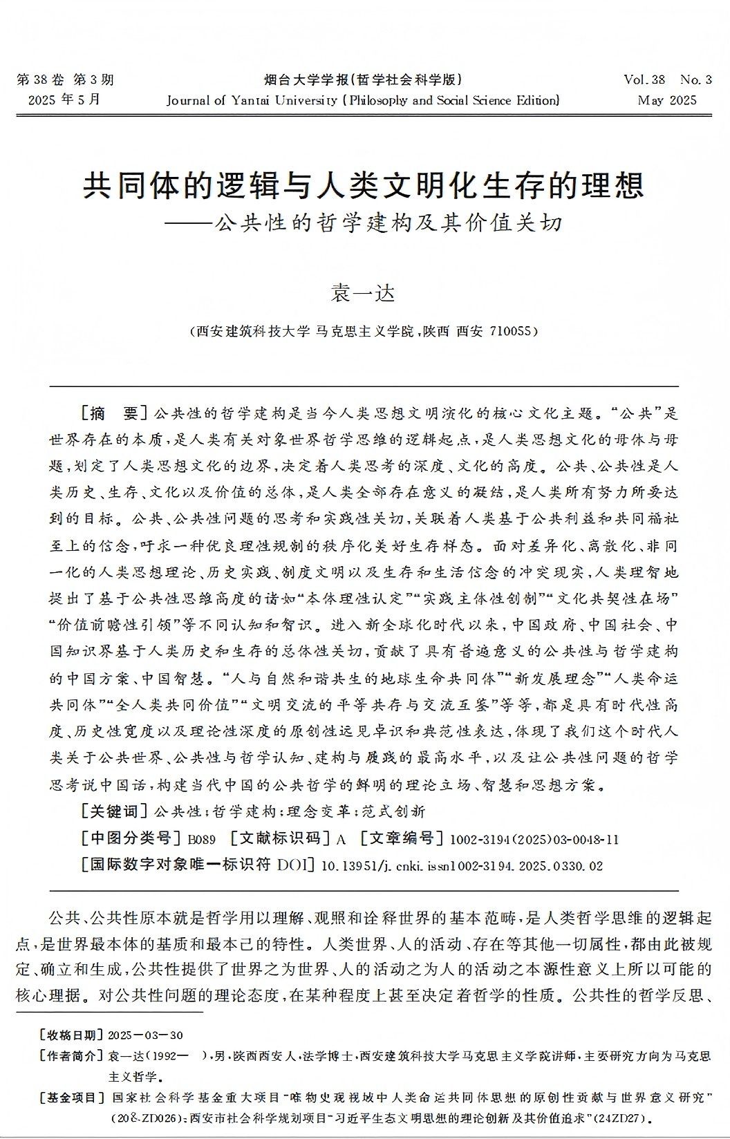 近日,我院教师袁一达发表在《烟台大学学报(哲学社会科学版)》2025年第3期文章《共同体的逻辑与人类文明化生存的理想——公共性的哲学建构及其价值关切》,被《新华文摘》2025年第22期“论点摘编”以及《高等学校文科学术文摘》2025年第9期“学术卡片”转载。