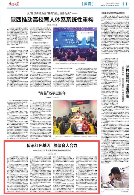 2026年2月25日,《陕西日报》以《传承红色基因 凝聚育人合力——陕西打造思政课实践教学一体化新范式》为题,对西安建筑科技大学马克思主义学院依托省级社科高端智库线上集体备课、构建数字化教学资源以及青年学子开展基层宣讲的情况进行报道。
